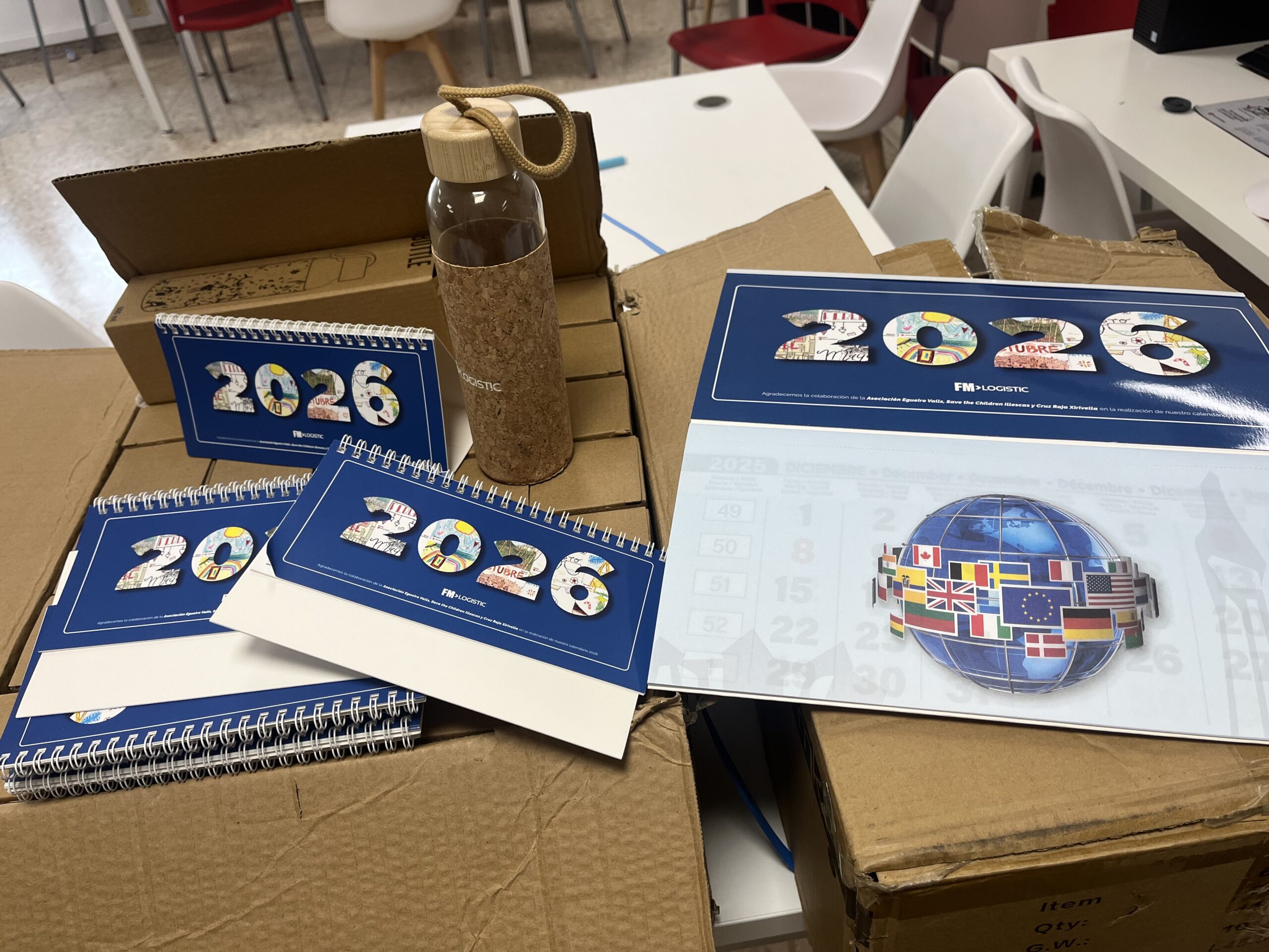 Les collaborateurs se sont donc mis au travail pour préparer et remettre un don conséquent de stylos, de cahiers et de bouteilles d’eau en verre siglées FM Logistic. Cette action a également mis en lumière le talent des enfants : les collaborateurs ont offert le calendrier d’entreprise 2026, dont les pages sont illustrées par des dessins réalisés par les jeunes issus de Save the Children, Egueiro et la Croix-Rouge.